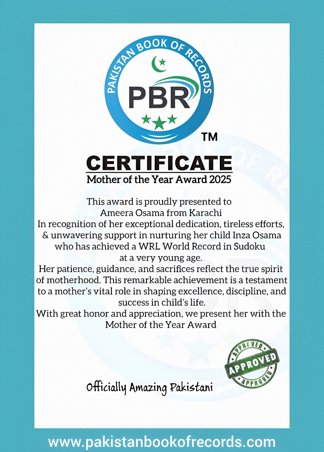 Kinza Roma (Lahore) Proudly recognized as the mother of Shael Shan, a PBR National Record Holder and WRL World Record Holder in Intelligence. Awarded the PBR Mother of the Year Award for her unwavering support, encouragement, and dedication qualities that have been instrumental in her son’s extraordinary success. As a devoted homeschooling mother, Kinza Roma cultivated Shael’s potential with exceptional teaching methods. Her efforts led to his outstanding accomplishments, earning both national and global recognition all before the age of four.