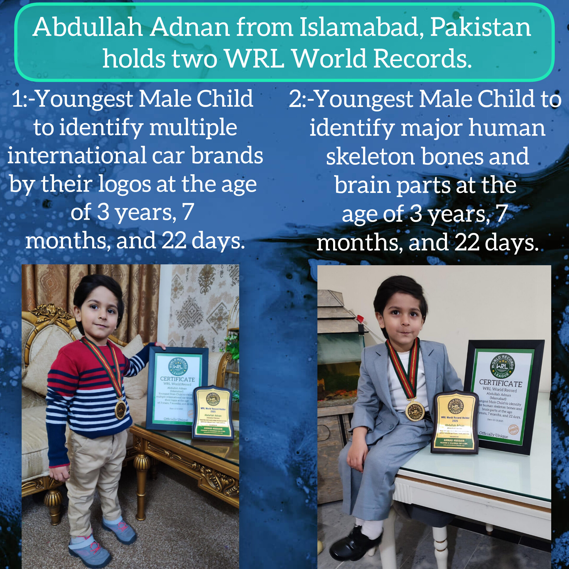 Ms. Sumble Arif Lecturer at King Edward Medical University Lahore, Pakistan has officially set a New WRL World Record by successfully reciting the names of 195 countries in an impressive time of 1 minute & 30 seconds. Her achievement has been verified & recognized as an outstanding display of memory, speed, and accuracy.